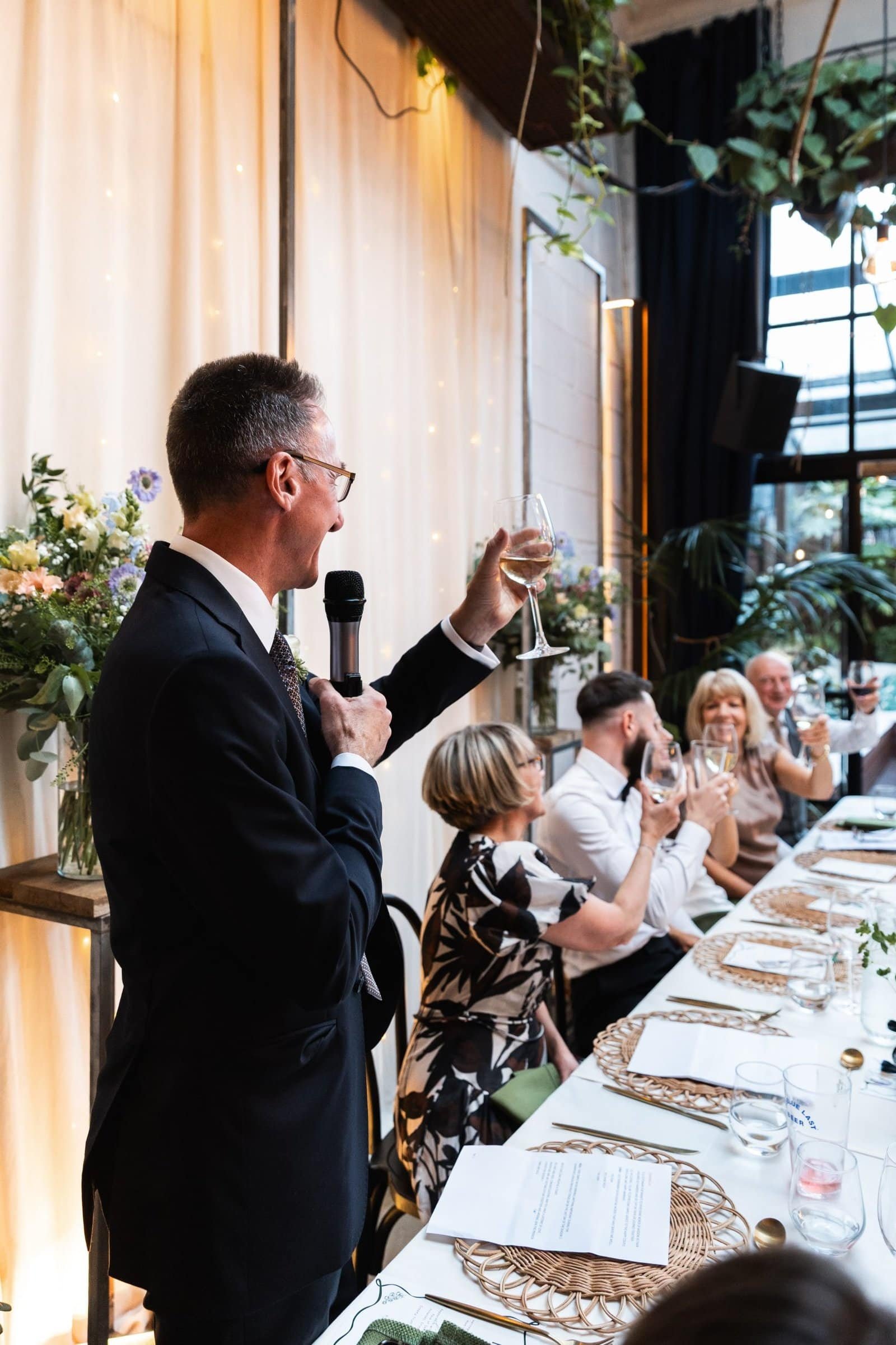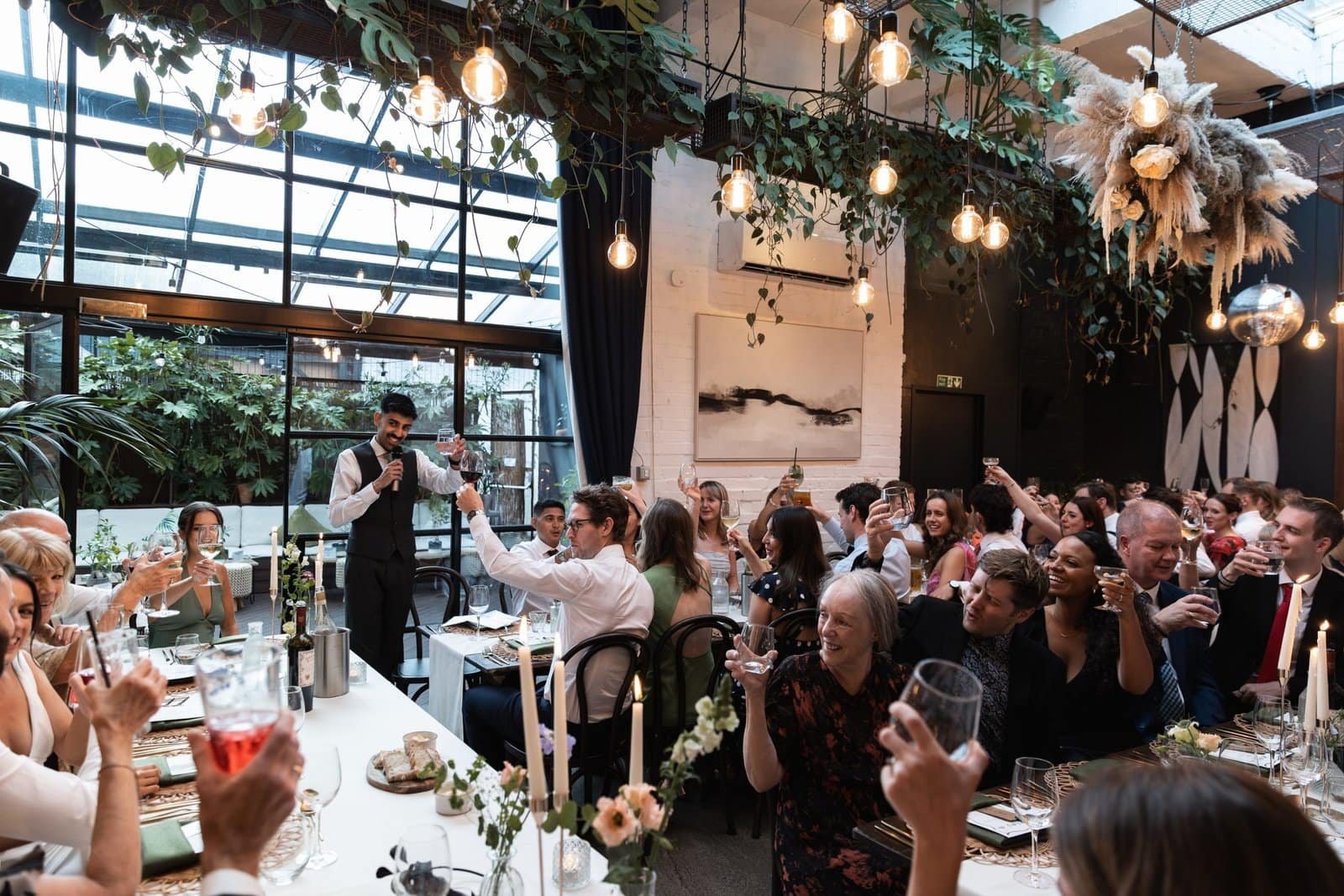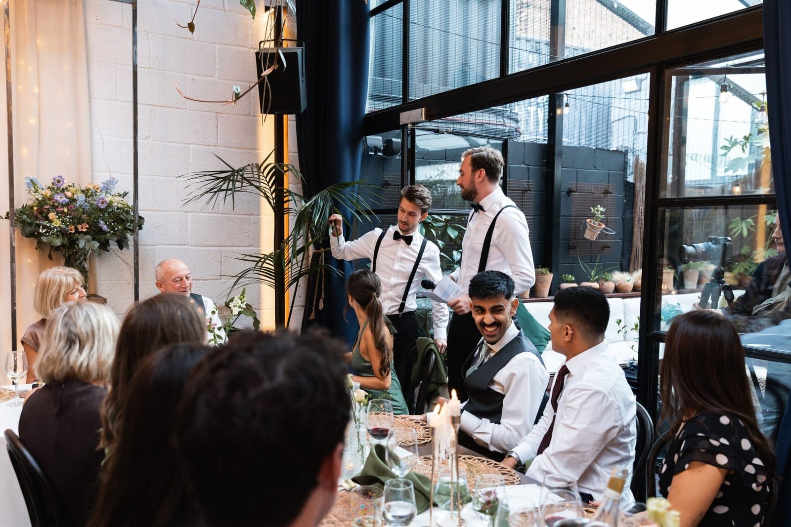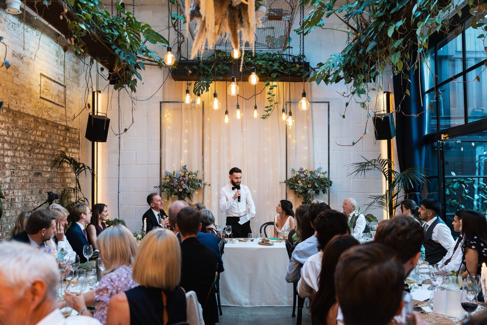By the time we arrived back at The Hackney, the reception was already in full swing. It doesn’t take much looking at these photos to know why this is one of my favourite London venues as a wedding photographer. The space was dressed beautifully with florals, and the green and gold of the wedding breakfast tablescape was a perfect match for the venue’s leafy, textural interiors. Every guest found a personalised, hand-made flower-pressed bookmark waiting at their place setting – including Libby and I! (Thanks guys, I use it every day!)