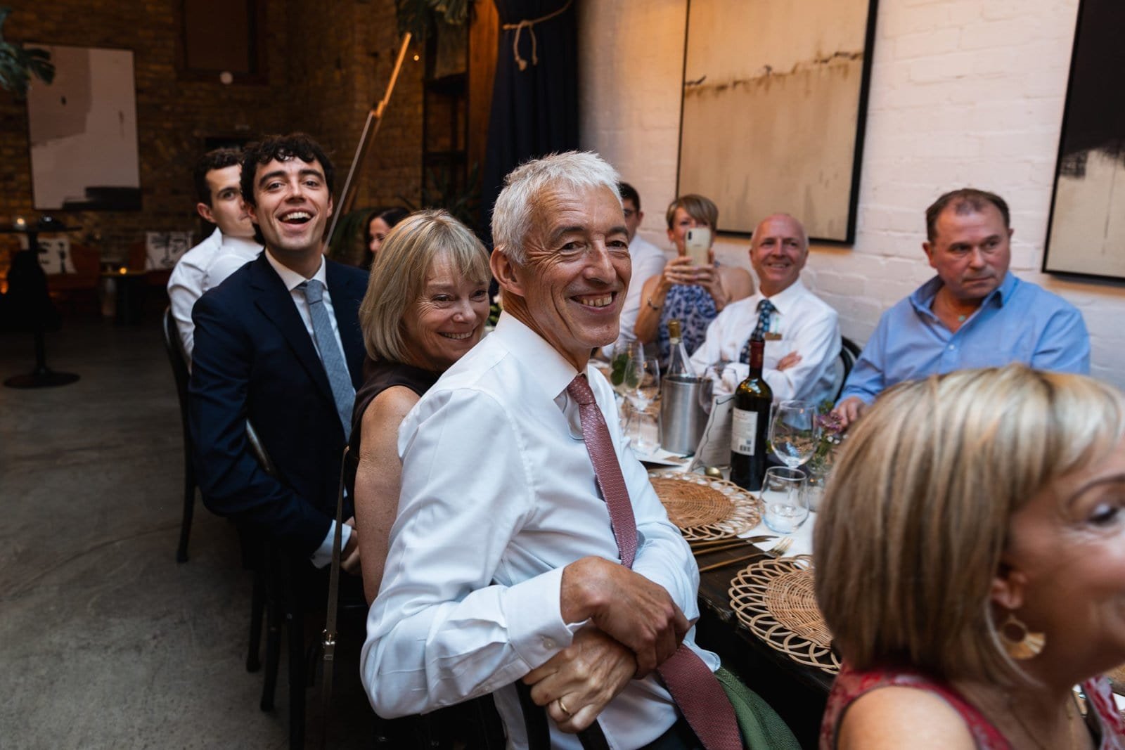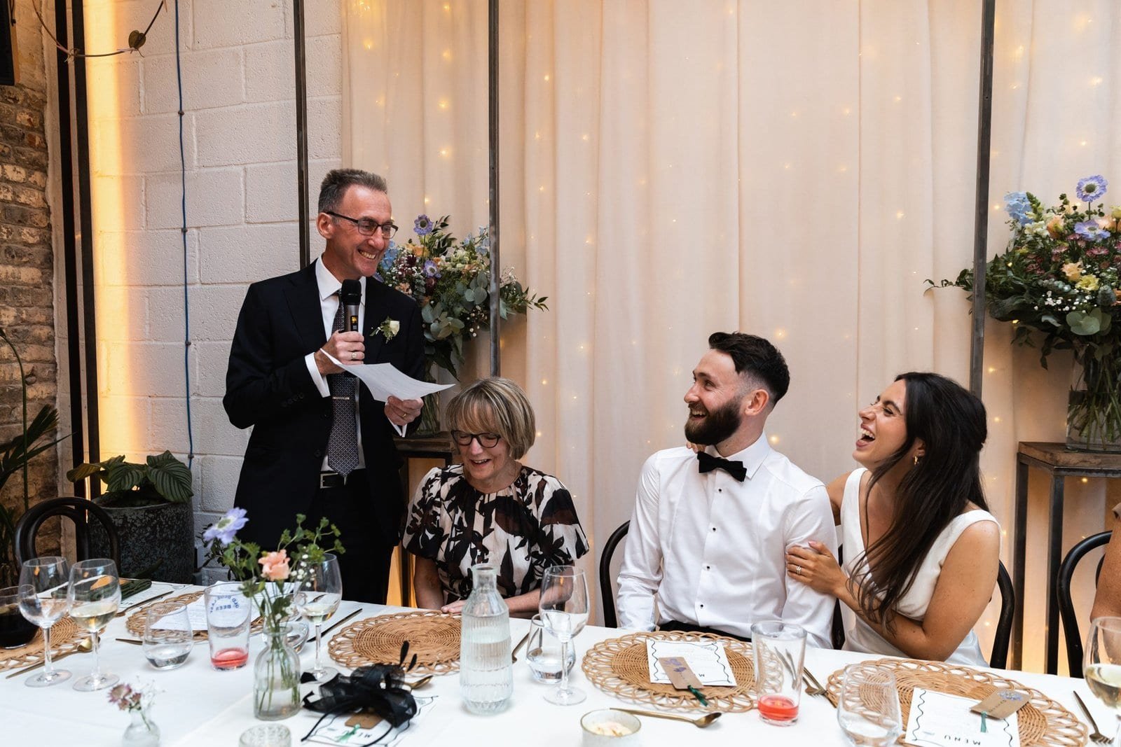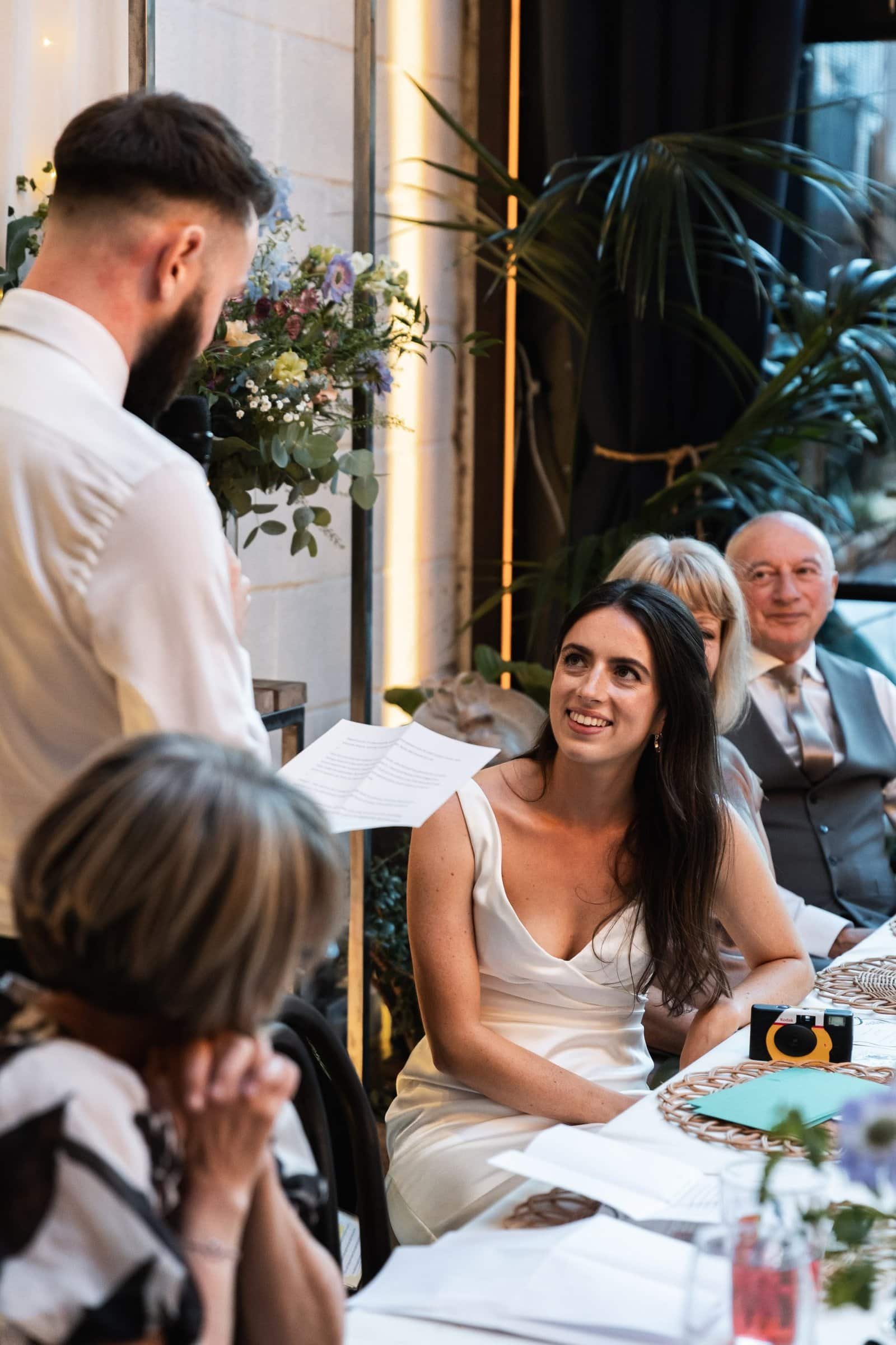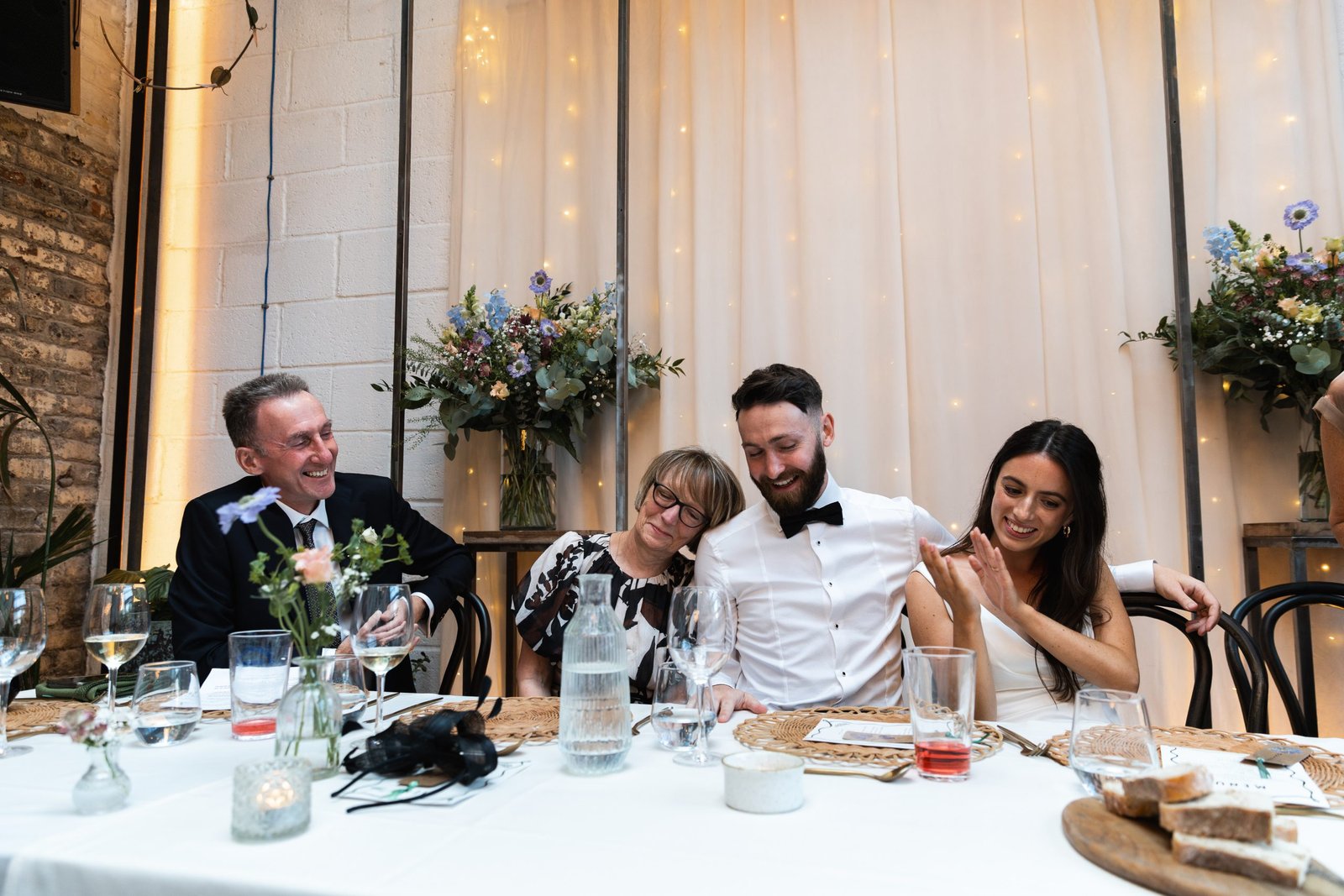 By the time we arrived back at The Hackney, the reception was already in full swing. It doesn’t take much looking at these photos to know why this is one of my favourite London venues as a wedding photographer. The space was dressed beautifully with florals, and the green and gold of the wedding breakfast tablescape was a perfect match for the venue’s leafy, textural interiors. Every guest found a personalised, hand-made flower-pressed bookmark waiting at their place setting – including Libby and I! (Thanks guys, I use it every day!)