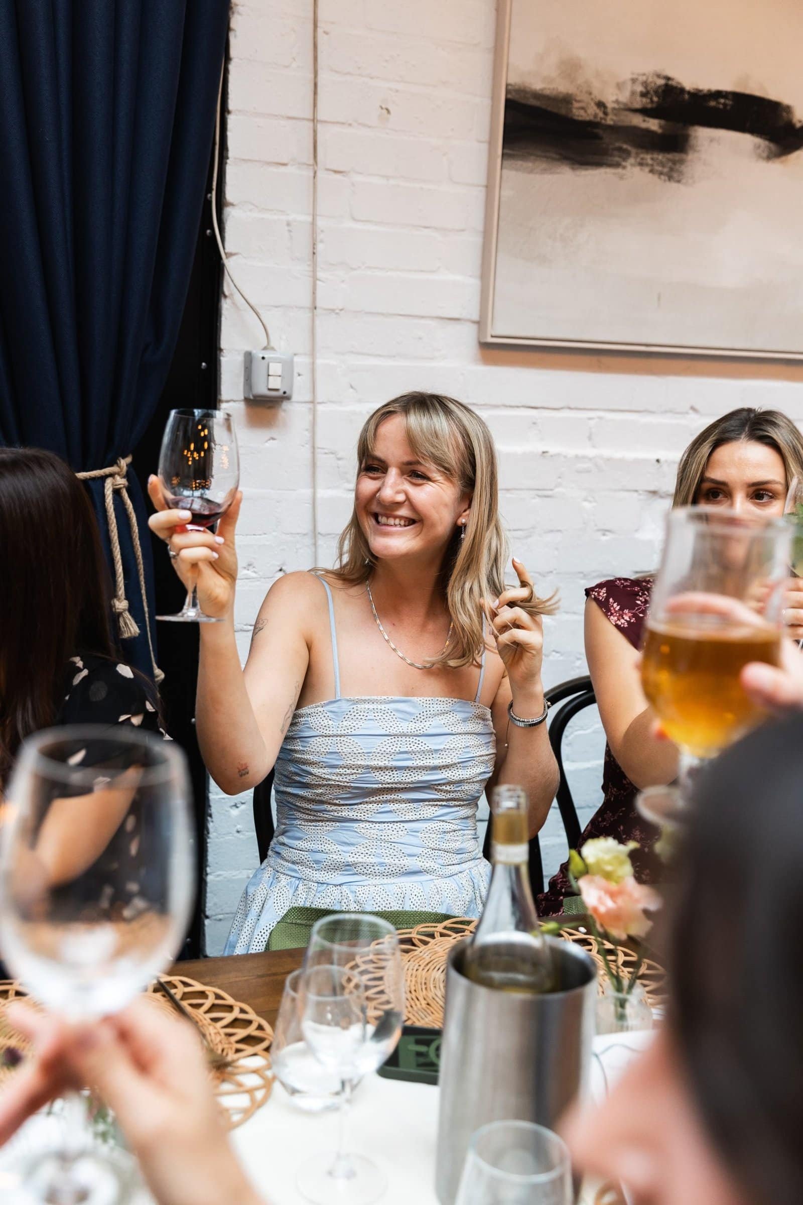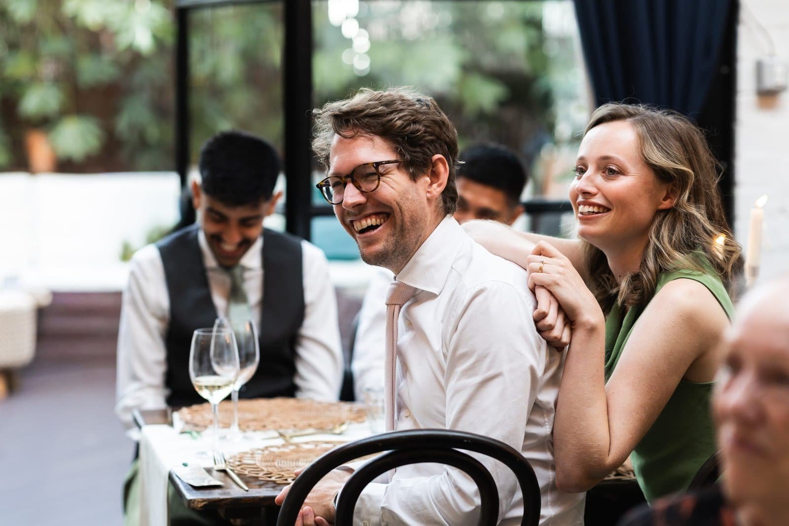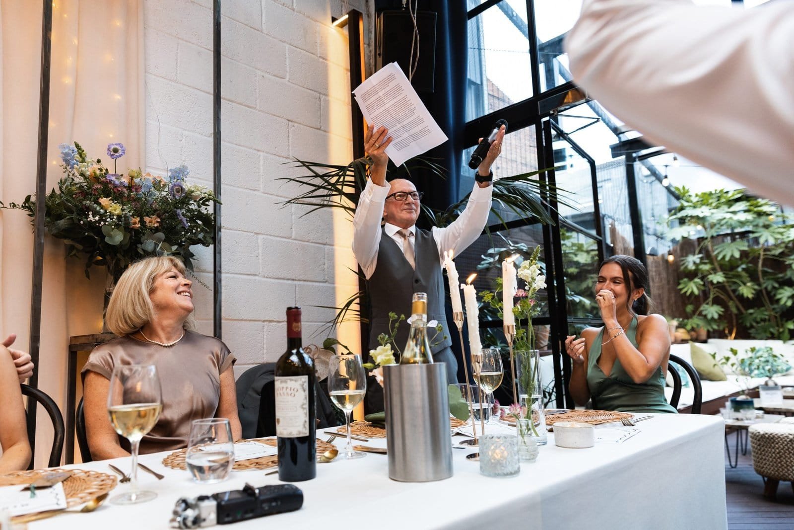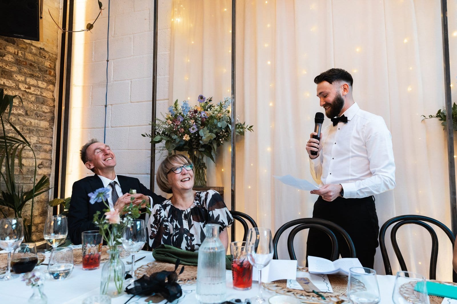 By the time we arrived back at The Hackney, the reception was already in full swing. It doesn’t take much looking at these photos to know why this is one of my favourite London venues as a wedding photographer. The space was dressed beautifully with florals, and the green and gold of the wedding breakfast tablescape was a perfect match for the venue’s leafy, textural interiors. Every guest found a personalised, hand-made flower-pressed bookmark waiting at their place setting – including Libby and I! (Thanks guys, I use it every day!)