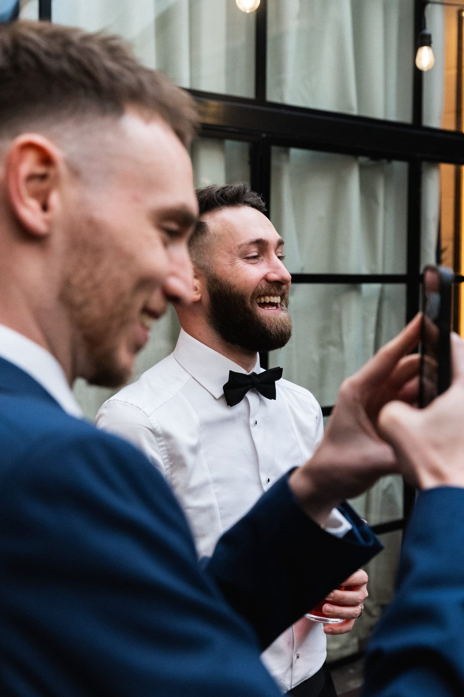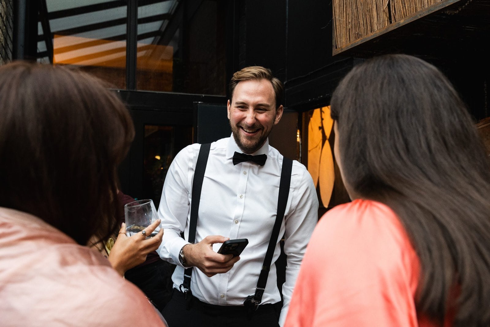 The boys immediately cracked into their cocktail stash and filled up their new personalised hipflasks as they flicked through the stag do photo album Chris by his groomsmen. Once they worked out how to get their bow ties looking right, we headed to the lobby of The Ned for some groomsmen photos – I tried out something new with a more narrow direct flash for impact during the groom’s portraits, and love how the photos came out!