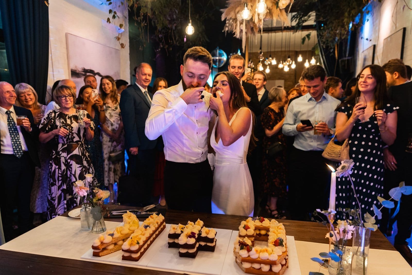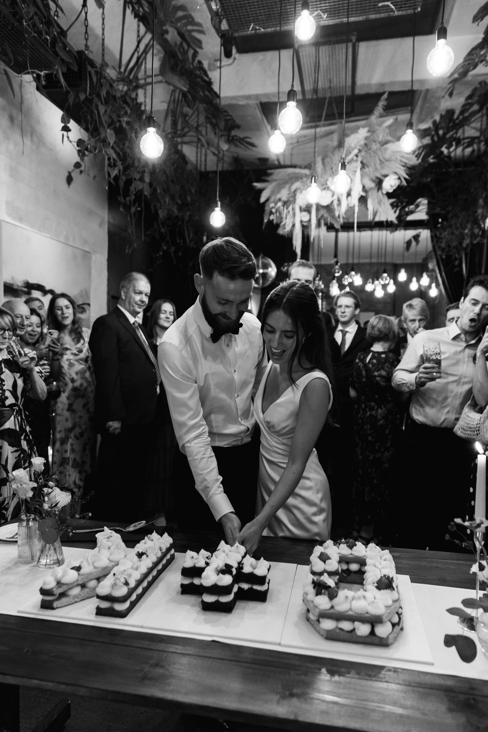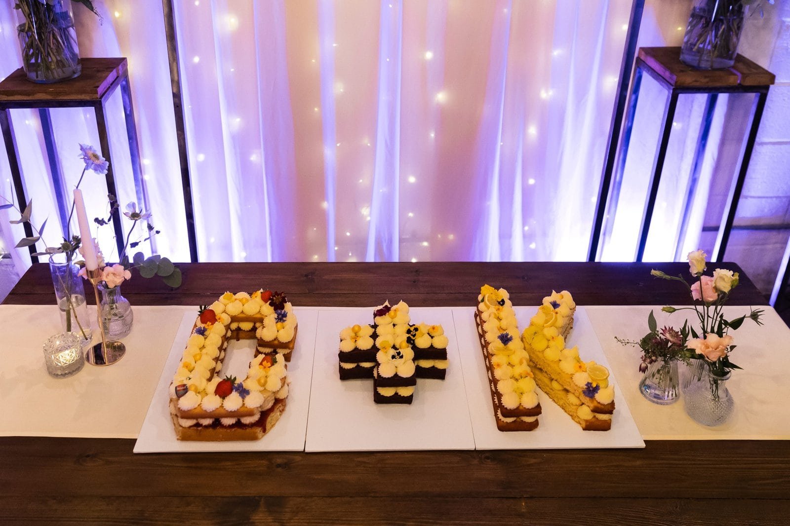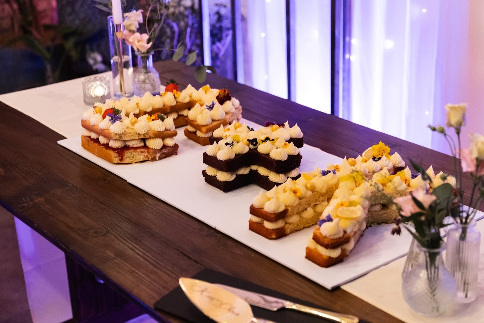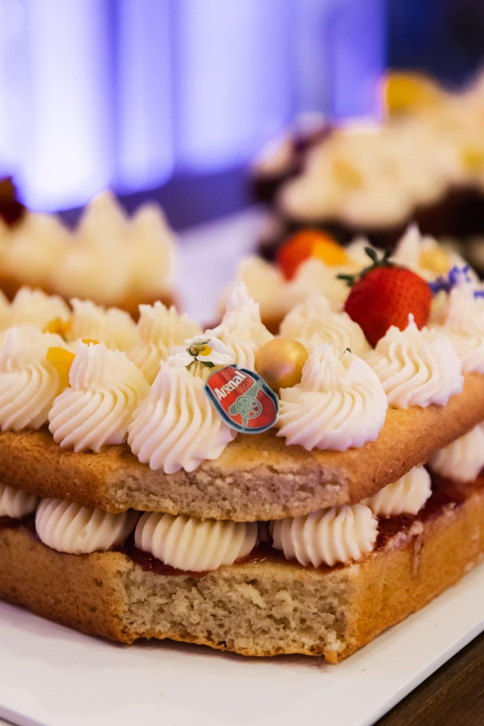 And then onto the cake cut… the bride’s very talented sister, Tasmin, made the wedding cake: three bold, sculptural pieces spelling out “K + C.” A subtle nod to Arsenal was tucked into the icing, a detail that made some (Chris.) smile more than others.